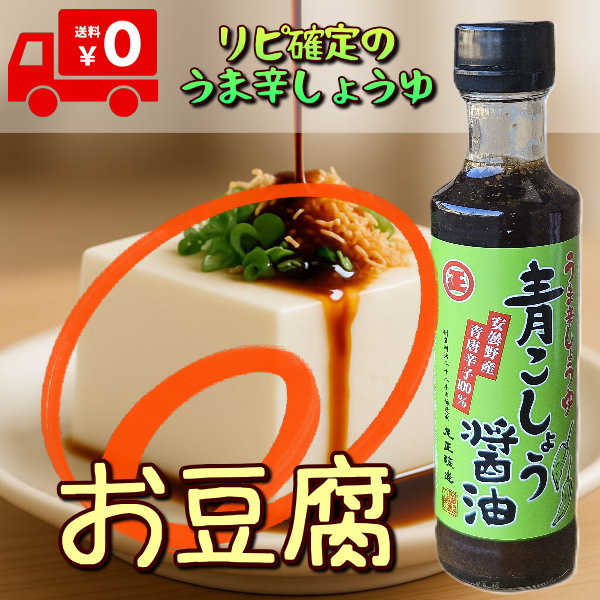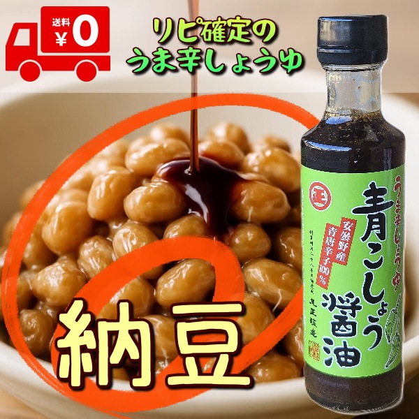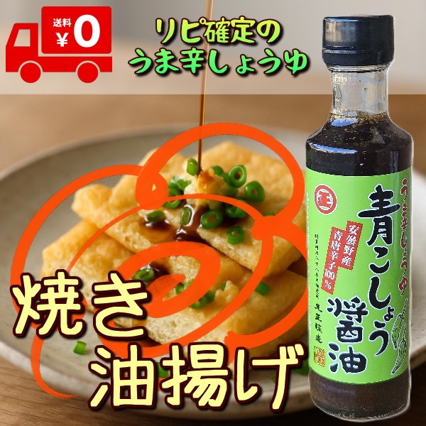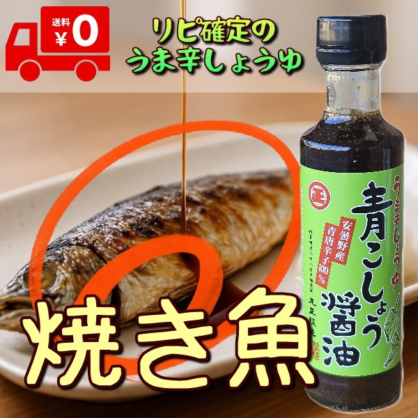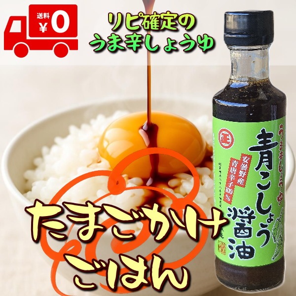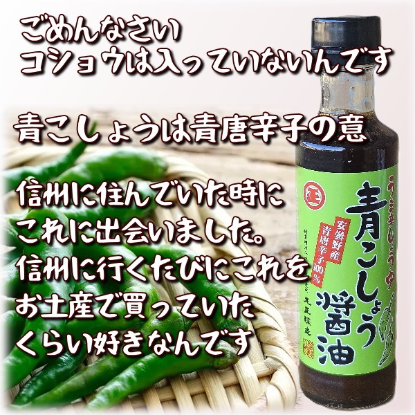 | 原材料名 | しょうゆ(国内製造)、青唐辛子、蛋白加水分解物、砂糖/調味料(アミノ酸等)、甘味料(甘草)、(一部に大豆、小麦を含む) |