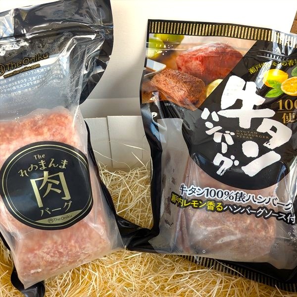 The そのまんま肉バーグ&瀬戸内レモン香る牛タン100%肉バーグの2種類が入った、ハンバーグ食べ比べセットです!